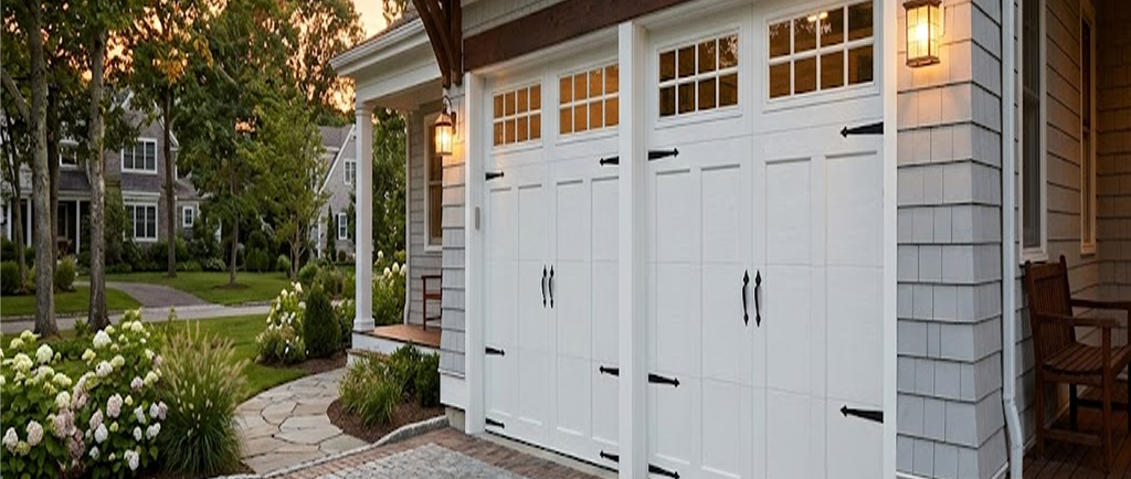 Many coastal style garage doors include feature windows to enhance visual balance and allow natural light into the garage.